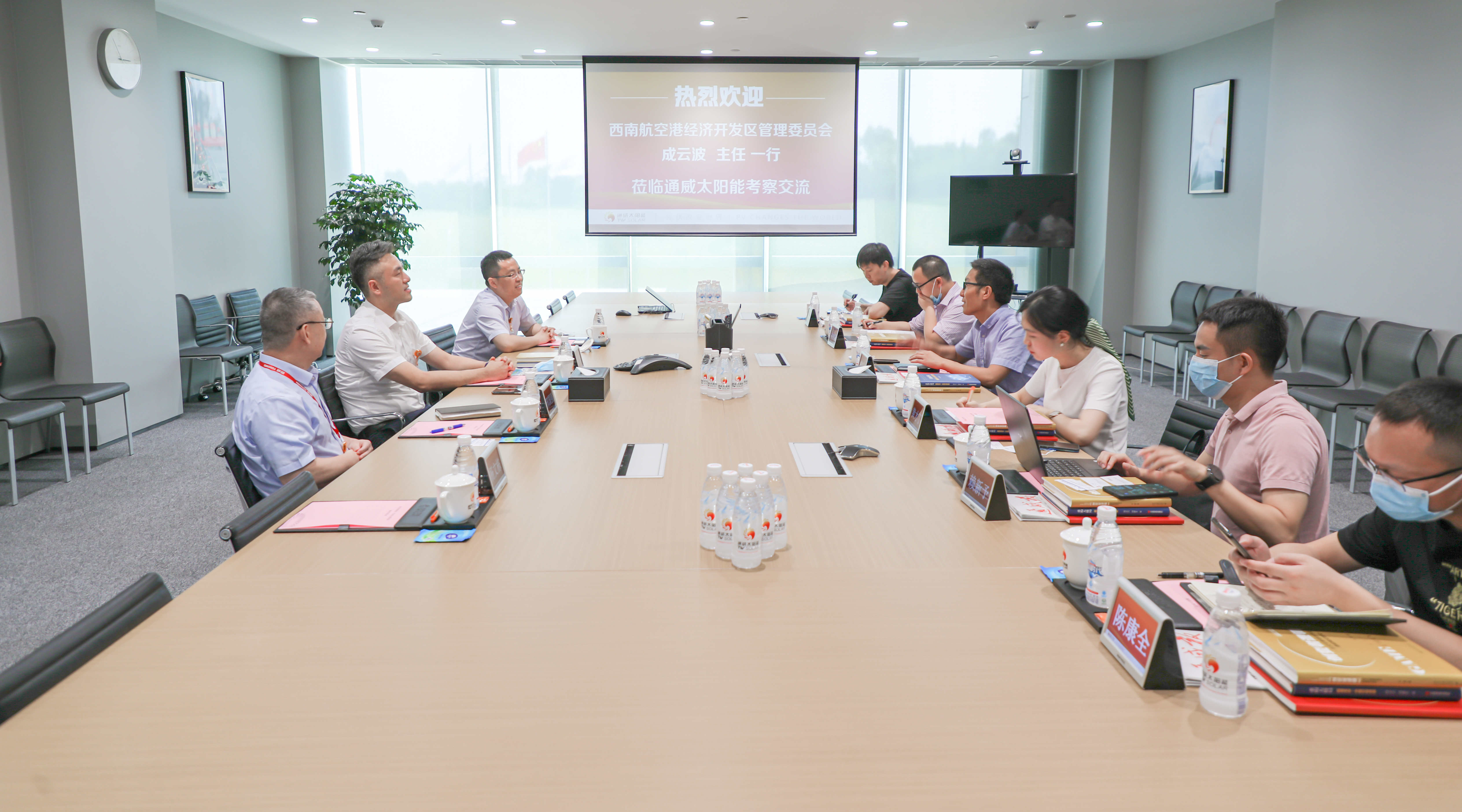 8月6日,西南航空港經(jīng)濟開發(fā)區(qū)管委會主任成云波一行蒞臨通威太陽能雙流基地調(diào)研考察,通威太陽能董事長兼總經(jīng)理周丹、通威股份光伏首席技術(shù)官邢國強、通威太陽能副總經(jīng)理周華熱情接待。