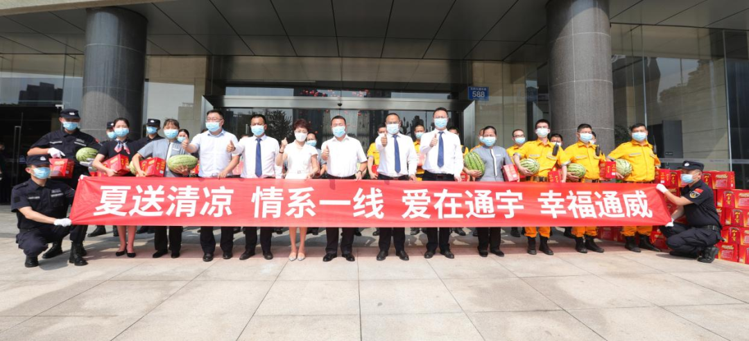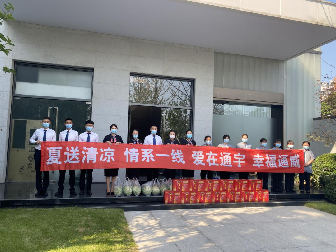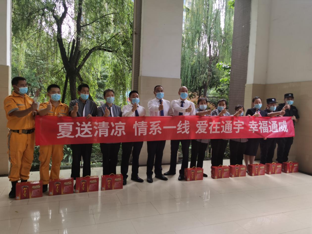 八月以來,全國各地的氣溫節節攀升,多地爆發橙色高溫預警,此外,全國范圍內呈疫情復發趨勢,成都也出現多例確診病例。在嚴峻的形勢下,遵照通威集團董事局劉漢元主席的指示,通宇物業全體員工不懼困難和高溫,始終堅守崗位,奮戰在抗疫一線。在橙色高溫預警下,為關心一線戰疫員工,8月4日,通威集團禚玉嬌總裁,集團黨委副書記、副總裁黃其剛帶隊,代表集團董事局劉漢元主席親切慰問通威國際中心奮戰在抗疫一線的物業員工,并送上清涼福利。