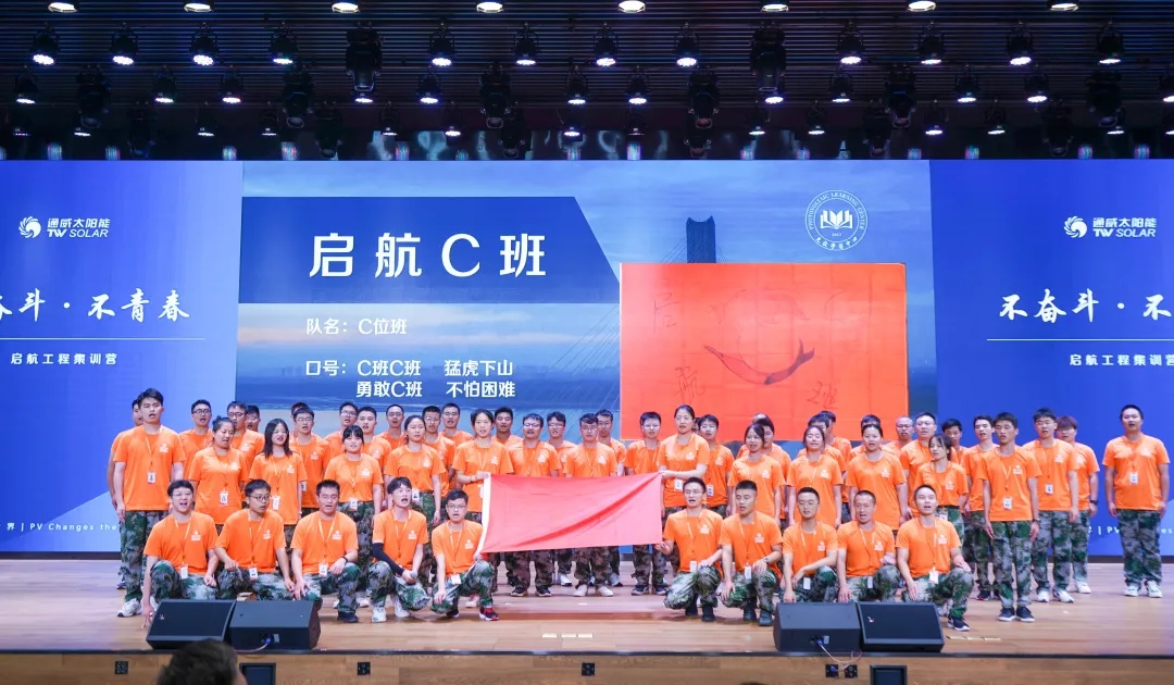 周董現(xiàn)場分享了劉漢元主席的一席話,寄語大家雖然身處一個(gè)優(yōu)秀的行業(yè)和一個(gè)優(yōu)秀的公司,但也面臨著“不是九死一生,而是九九死一生”的外部競爭環(huán)境,希望大家一定要有危機(jī)意識,不放棄、謀大局,解難題、展宏圖,秉承“每天進(jìn)步1%”的堅(jiān)定信念和奮斗觀、價(jià)值觀,在光伏領(lǐng)域貢獻(xiàn)自己的一份力量,“艱難困苦,玉汝于成”,方能看到中國光伏行業(yè)光明的未來。 開營儀式現(xiàn)場 為了充分體現(xiàn)活動(dòng)的儀式感,激發(fā)學(xué)員們的奮斗熱情,光伏學(xué)習(xí)中心在隨后的儀式環(huán)節(jié)中,還精心組織了班級文化展示、授旗儀式、集體宣誓等一系列活動(dòng),充分展現(xiàn)了新一屆學(xué)員的卓越才華和精神風(fēng)貌。在開營視頻中,多名往屆“啟航工程”優(yōu)秀學(xué)員代表,動(dòng)情地分享了自己從一名應(yīng)屆畢業(yè)生成長為工程師的點(diǎn)點(diǎn)滴滴,將整個(gè)活動(dòng)推向高潮。 班級文化展示 為深入了解通威太陽能的運(yùn)營模式、產(chǎn)品優(yōu)勢,認(rèn)識企業(yè)在整個(gè)行業(yè)內(nèi)的價(jià)值坐標(biāo),在15天的集訓(xùn)過程中,集訓(xùn)營將通過走進(jìn)通威、團(tuán)隊(duì)熔煉、素養(yǎng)提升、行業(yè)認(rèn)知、安全認(rèn)知等培訓(xùn)活動(dòng),以面授課程、素質(zhì)拓展、實(shí)地參觀、小組研討、頭腦風(fēng)暴、每日考評等方式,讓廣大學(xué)員們享受到一場既有系統(tǒng)性、多樣性,又富有挑戰(zhàn)性、趣味性的學(xué)習(xí)之旅,構(gòu)建以自我發(fā)展為核心的學(xué)習(xí)體系,助力學(xué)員快速成長。 通威太陽能首席運(yùn)營官蕭圣義向?qū)W員代表們授旗 “啟航工程”人才培養(yǎng)項(xiàng)目是通威光伏學(xué)習(xí)中心創(chuàng)新人才培養(yǎng)體系的重要舉措,其目標(biāo)是通過2-3年的專項(xiàng)培養(yǎng)為通威太陽能儲(chǔ)備并輸出骨干及以上人才。該項(xiàng)目自2016年啟動(dòng)至今,5年來累計(jì)將600余名校招生培養(yǎng)為公司骨干,有效支撐了公司快速發(fā)展對內(nèi)培人才的需求,為推動(dòng)公司戰(zhàn)略落地做出了巨大貢獻(xiàn),也成為公司雇主品牌形象建設(shè)的一張亮麗名片。未來,光伏學(xué)習(xí)中心將繼續(xù)秉承系統(tǒng)、全面、扎實(shí)的培養(yǎng)風(fēng)格,不斷創(chuàng)新探索人才發(fā)展模式,為選擇通威的優(yōu)秀“后浪”們托舉希望,為公司前行源源不斷地輸入朝氣蓬勃的新生代力量。
