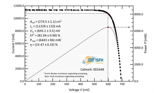 2021年7月,通威太陽能利用PERC量產設備,通過電池制程工藝創新,M6大尺寸全面積(Area=274.50cm2)電池轉化效率可達23.47%,并經ISO/IEC 17025第三方國際權威機構認證,創造了M6大尺寸全面積產業化PERC電池效率的世界紀錄。