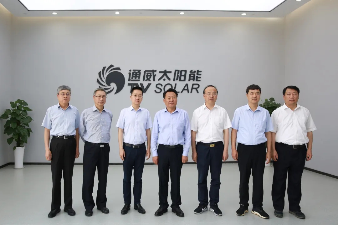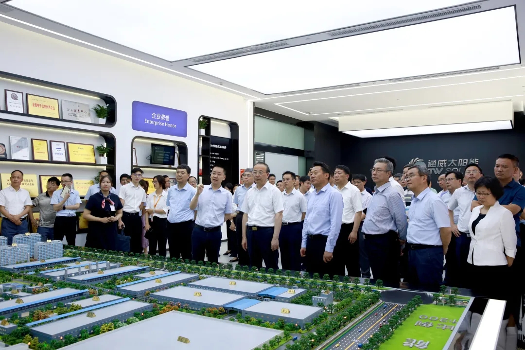 參觀過程中,虞愛華書記、張祥安書記同謝毅董事長親切交談,雙方就光伏行業發展前景、市場環境等方面展開深入交流。謝毅董事長詳細介紹了公司發展歷程、產能規模、創新智造、未來規劃、企業榮譽等情況,并表示,近年來,從中央到省市各級政府都在大力支持光伏行業發展,為企業營造了良好的營商環境。通威太陽能牢牢把握工業互聯網與能源變革等系列重大機遇,深耕新能源產業,持續深化創新發展,連創光伏行業產能規模、出貨量、盈利能力等諸多全球第一的成績,刷新光伏行業新記錄,短短幾年已發展成為全球單體規模最大的晶硅太陽能電池企業,樹立了光伏行業智能制造的典范。