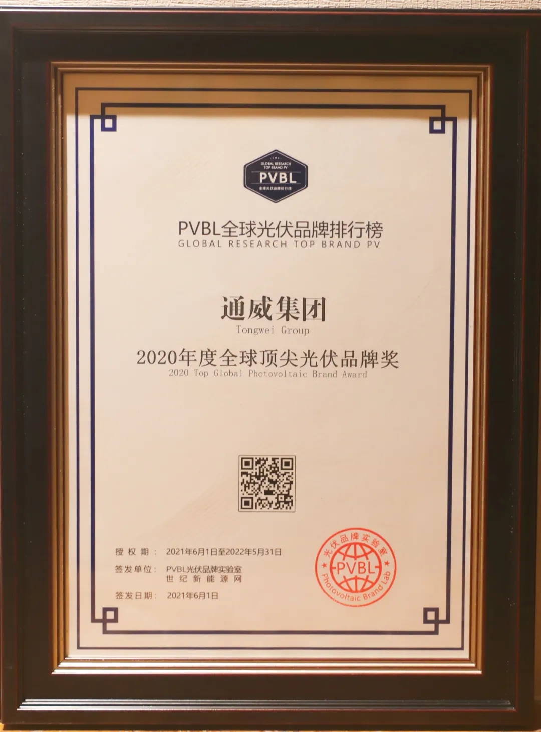 此次榮獲PVBL2020年度全球頂尖光伏品牌獎”,再次彰顯了通威雄厚的發展實力和強勁的品牌影響力。近年來,通威先后榮獲“中國品牌年度大獎新能源NO.1”、“2021中國上市公司品牌價值活力榜”前十、“最具品牌影響力企業”、“大國匠心品牌”、“最具品牌價值公司”等系列品牌榮譽。