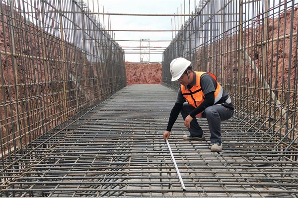 薛磊正在項目上檢查管溝鋼筋綁扎情況