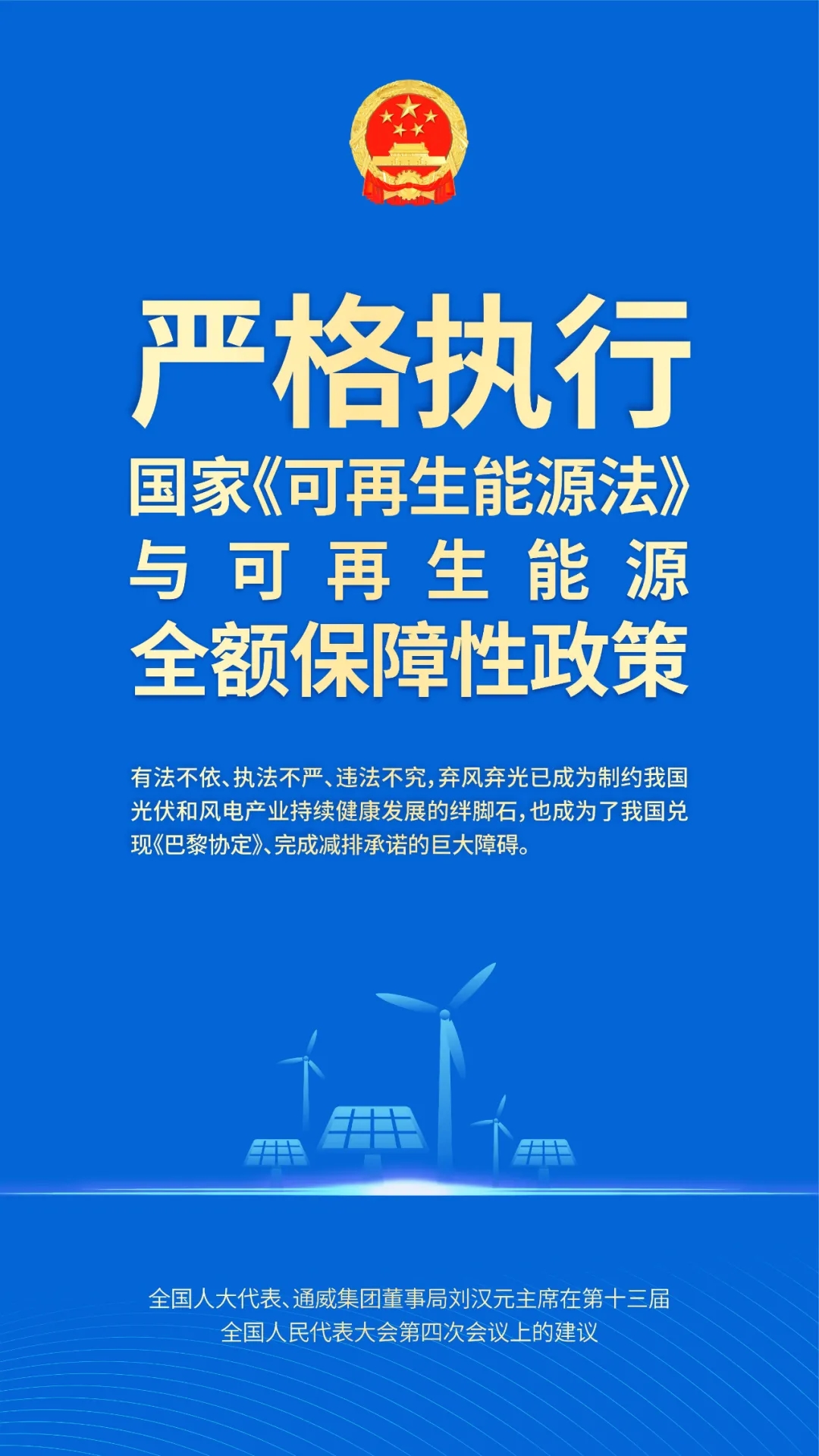 3月11日,第十三屆全國人民代表大會第四次會議在北京人民大會堂勝利閉幕。中共中央總書記、國家主席、中央軍委主席習近平等黨和國家領導人出席會議。全國人大代表、通威集團董事局劉漢元主席在京參加閉幕式。今年兩會期間,劉漢元主席充分履行作為全國人大代表建言資政的職能,針對加快碳中和進程、筑牢我國能源和外匯安全體系,落實可再生能源保障性收購和優先上網政策,優化儲能發展模式、保障可再生能源有效消納等方面提出合理建議,受到人民日報、新華社、中央電視臺、中新社等150余家主流權威媒體的廣泛關注,共推出300余篇報道。