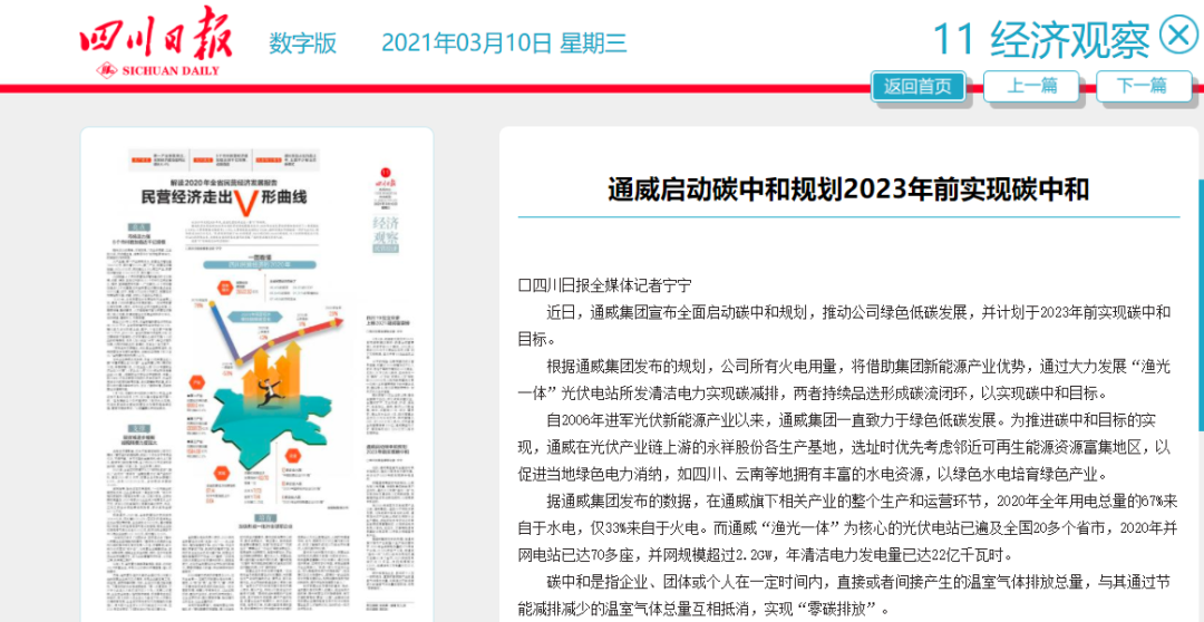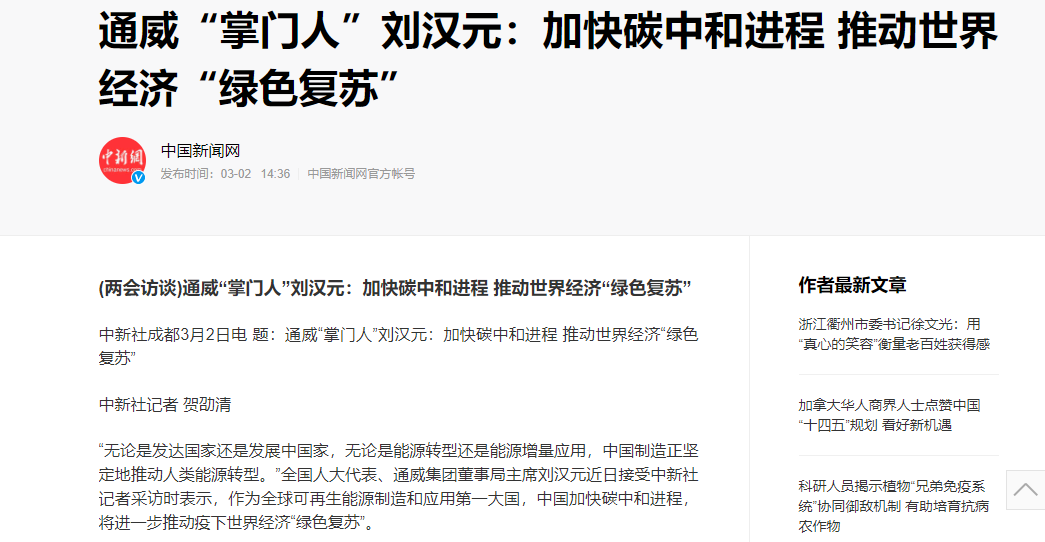 中新社以《通威“掌門人”劉漢元:加快碳中和進程 推動世界經濟“綠色復蘇”》為題推出劉漢元主席兩會專題文章,劉漢元主席在報道中表示,無論是發達國家還是發展中國家,無論是能源轉型還是能源增量應用,中國制造正堅定地推動人類能源轉型,作為全球可再生能源制造和應用第一大國,中國加快碳中和進程,將進一步推動疫情下世界經濟“綠色復蘇”。