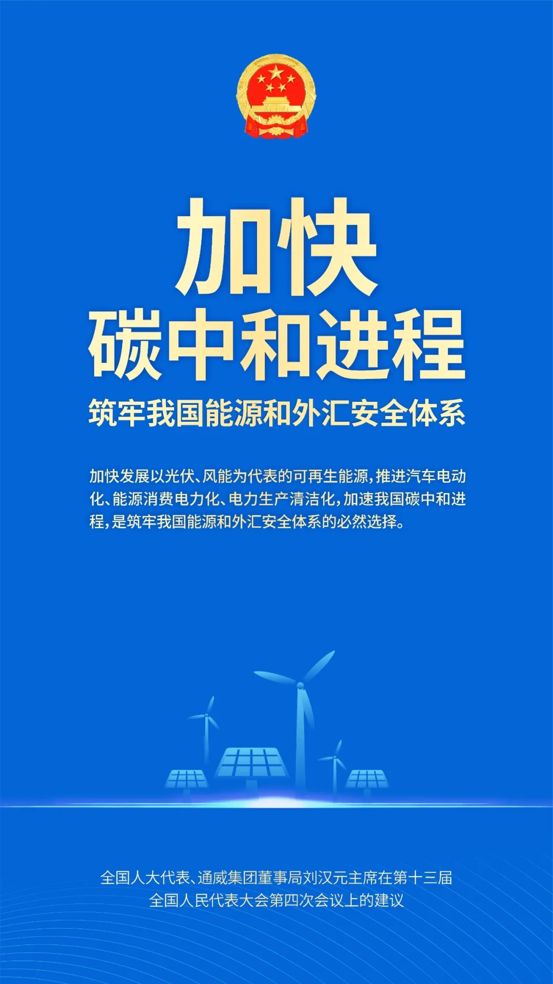 3月4日,新華社APP推出題為《全國人大代表、通威集團董事局主席劉漢元:牢牢掌握國家能源供給主動權》的專題報道,精彩觀點引起廣泛關注,瀏覽量迅速突破90萬。劉漢元主席在報道中表示,建議加快推進汽車電動化、能源消費電力化、電力生產清潔化,加快碳中和進程,筑牢我國能源和外匯安全體系。即通過10年到20年時間,實現我國能源增量70%以上、存量50%以上的可再生清潔化替代,在推動碳中和進程的同時,將國家能源供給的主動權牢牢掌握在自己手中,解決石油進口被“卡脖子”的問題,實現我國能源的安全保障和獨立供應,節省大量外匯支出,為我國經濟高質量發展、國家戰略安全保駕護航。