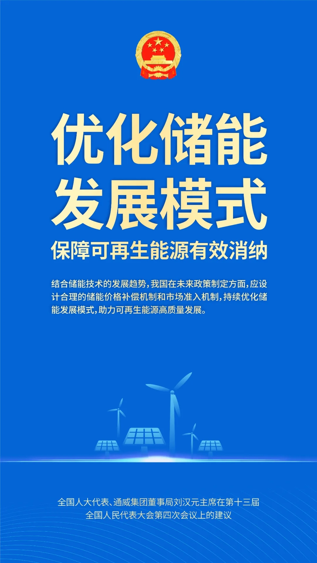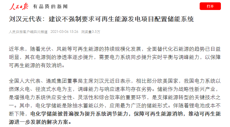 3月6日,人民日報客戶端以《劉漢元代表:建議不強制要求可再生能源發電項目配置儲能系統》為題推出報道。劉漢元主席在報道中表示,結合儲能技術的發展趨勢,我國在未來政策制定方面,應當充分考慮儲能在推動可再生能源消納以及提升電網穩定性等方面的正外部性,設計合理的儲能價格補償機制和市場準入機制,持續優化儲能發展模式,助力可再生能源高質量發展,建議不強制要求可再生能源發電項目配置儲能系統,以提高儲能的利用效率、減少資源浪費。建議支持發展系統側集中式儲能系統,將抽水蓄能電站、儲能基地納入電力發展規劃與統一調度范圍,通過招投標等市場化方式確定項目業主。建議加快電力輔助服務市場建設,引導鼓勵儲能以獨立輔助服務提供商的角色參與市場交易,發展儲能市場化商業模式。