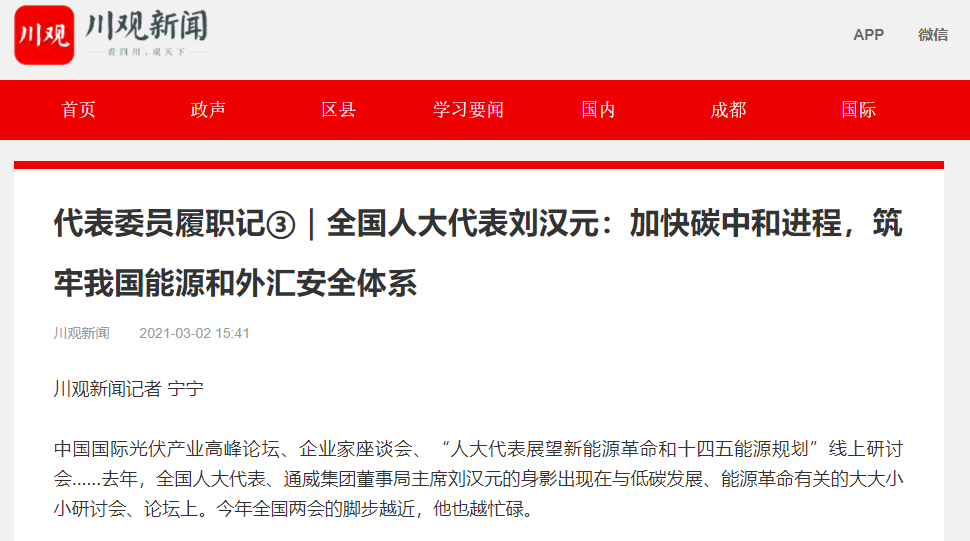 今年全國兩會,劉漢元主席針對加快碳中和進程、筑牢我國能源和外匯安全體系,落實可再生能源保障性收購和優先上網政策,優化儲能發展模式、保障可再生能源有效消納等方面提出合理建議,受到主流媒體的高度關注,人民日報、新華社、中央電視臺、中國新聞社、光明日報、中華工商時報、四川日報、四川電視臺、金融投資報、上海證券報、21世紀經濟報道、每日經濟新聞、黑鷹光伏、華夏能源網、索比光伏網等百余家主流權威媒體的專題聚焦。