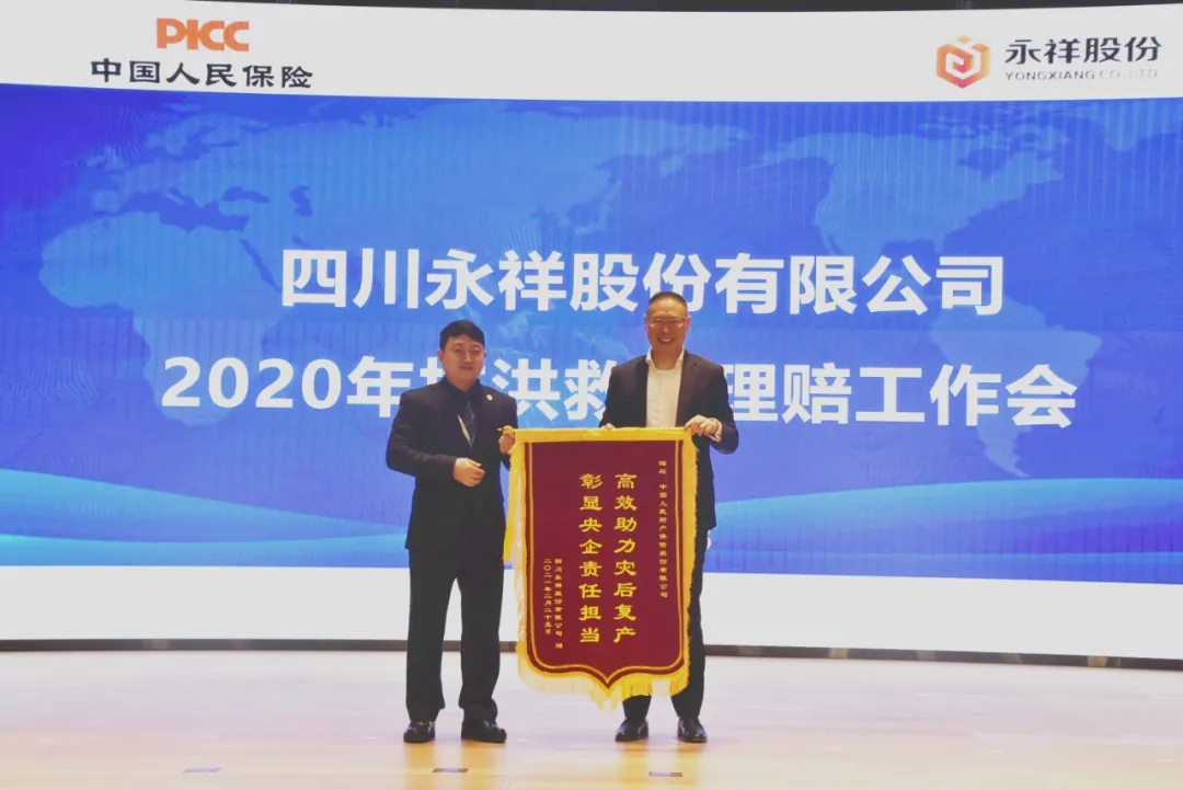 會上,中國人民財產(chǎn)保險股份有限公司樂山分公司總經(jīng)理黃建余與永祥股份財務(wù)總監(jiān)袁仕華進行賠付支票交接;段董向宋總贈送錦旗表達誠摯的謝意。