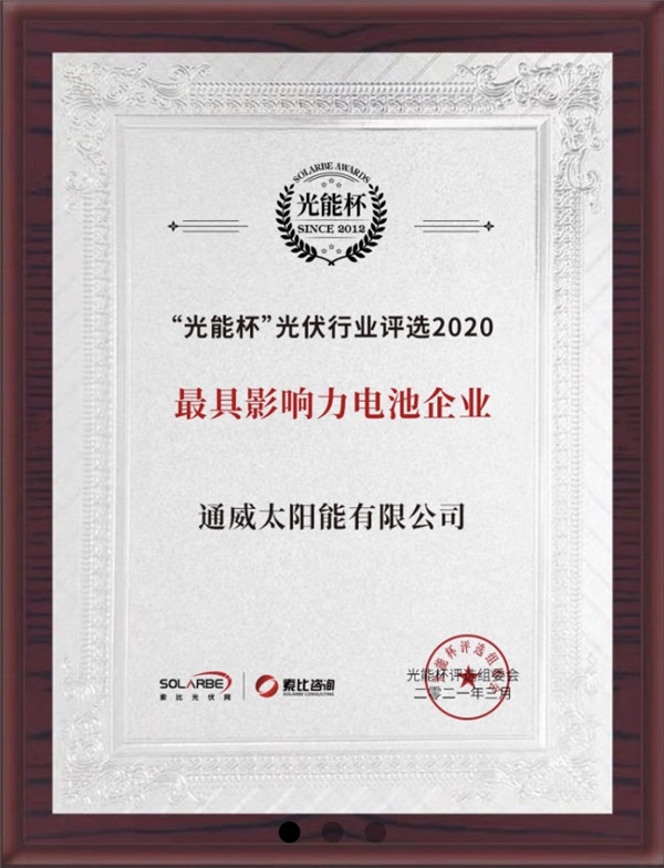 3月3日,由索比光伏網、索比咨詢聯合主辦的2020年度“光能杯”跨年分享會暨頒獎典禮圓滿落幕。通威太陽能有限公司憑借強大創新力、出色的品質與服務、卓越的品牌影響力,連續兩年擷取“最具影響力電池企業”大獎,并一舉摘得“2020光伏超級工廠”大獎。
