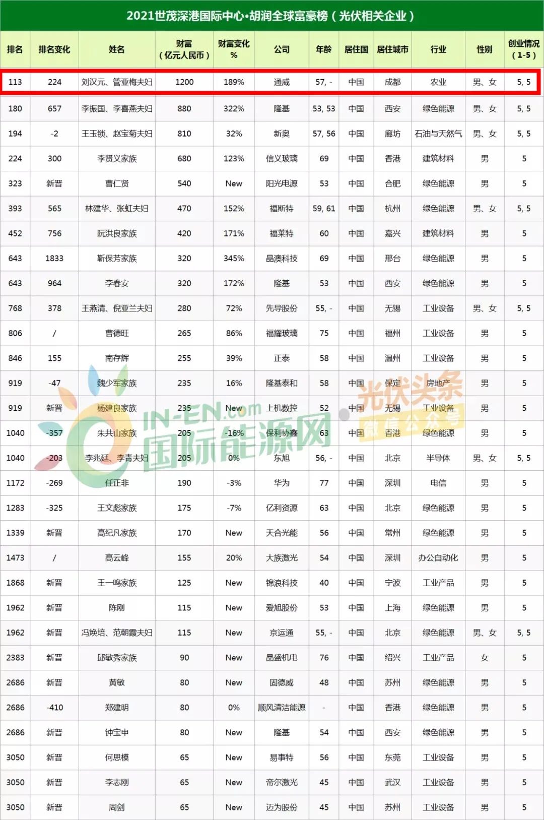 3月2日,胡潤研究院發布《2021胡潤全球富豪榜》。榜單顯示,今年共有來自68個國家、2402家公司的3228位十億美金企業家上榜,比去年新增412位,創歷史新高。十一屆全國政協常委、全國人大代表、通威集團董事局劉漢元主席,通威集團管亞梅董事長榮列榜單第113位,較去年上升224位。