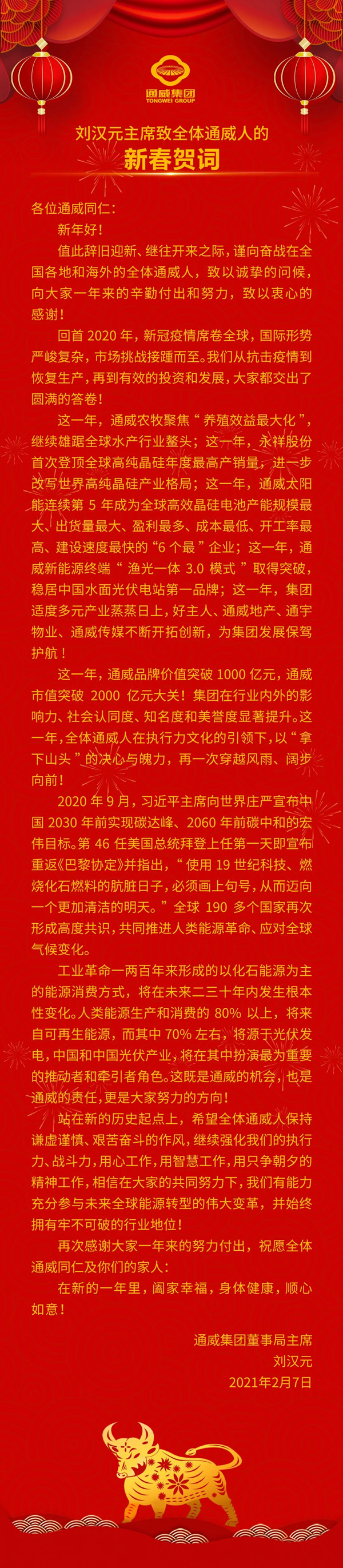 劉漢元主席致全體通威人的新春賀詞!
