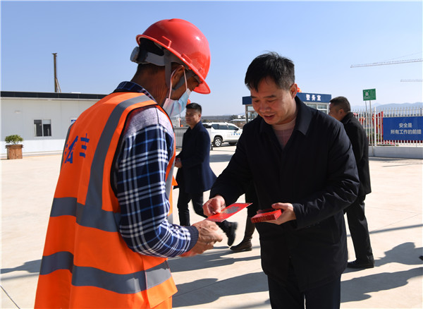慰問現場,杜總、閆總同慰問組一起對建設者們表示親切慰問,為他們送上慰問金,并祝大家新春快樂、闔家幸福!感謝他們?yōu)樵颇贤ㄍ椖拷ㄔO和保山經濟建設發(fā)展作出的貢獻。楊東偉副市長代表市委市政府給大家祝福和囑托:堅守崗位的員工在崗位上注意安全,和家人多溝通保平安,并繼續(xù)奉獻自己的能力,愿所有同志同云南通威一起,為完成項目建設共同努力,打造精品工程。