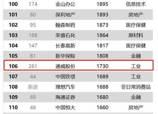2020年股市圓滿收官,中國上市公司市值500強榜單隨之揭曉。通威股份榮耀上榜,較2019年上升155位,榮列榜單106位,展示出了穩健的發展態勢和卓越的競爭實力。