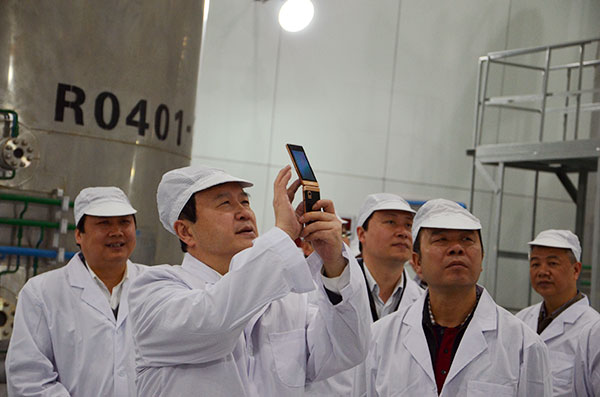 唐堅書記一行在馮德志董事長等公司主要領導陪同下,考察了永祥多晶硅主要裝置區,并在剛剛技改完成的1.2萬噸多晶硅生產現場,就技改建設及生產運行情況聽取了匯報。唐書記一行還穿上白大褂,興致勃勃地參觀了新建的還原生產車間,詳細了解了設備運行和產品質量情況,詢問了相關技術創新問題,并與公司技術專家就關心的問題進行了探討。在生產現場,唐書記看到剛剛出爐的高品質多晶硅,親自拿出手機拍照,稱贊永祥的科技創新成功推動企業技術升級,促進了高新技術產業增長極的形成。考察團的領導們與公司各相關人員交流過程中,氣氛愉快而熱烈,紛紛對公司技改工程的項目建設和良好生產運行表示贊賞,希望永祥多晶硅公司抓住有利時機,搶抓進度,爭取早日達產達標。談到多晶硅產業的發展,唐書記動容地說,通威集團劉漢元主席對光伏產業表現出極高的社會責任和使命感,并堅定地推動著光伏產業的發展,作為政府和各職能部門一定要鼓勵、支持、服務好企業,企業要進一步加強技術創新,加大技術的研發力度,生產出更多高品質和高附加值的產品,切實提高經營效益,增強市場競爭力,為光伏產業的發展做出更大的貢獻。