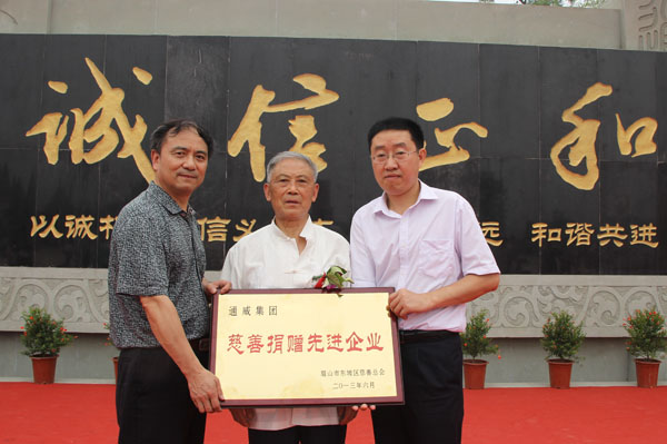 剪彩儀式上,眉山市東坡區黨委副書記嚴明宇向通威集團授予“慈善捐贈先進企業”的榮譽牌匾。陳總代表劉漢元主席對文化廣場的竣工表示祝賀,他介紹,通威作為發源于眉山市永壽鎮的企業,劉主席作為永壽鎮發展起來的著名企業家,為能積極支持和參與家鄉建設感到高興,希望永壽鎮用好捐贈資金,全力推動相關項目建設,真正將永壽通威文化廣場施工好、建設好、使用好、管理好,真正為家鄉父老提供一個休閑健身的一流場所。東坡區、永壽鎮黨政領導對劉漢元主席及通威集團對家鄉及眉山市經濟、文化和社會建設等各方面長期給予的寶貴支持表達了感謝,并表示將切實落實好捐贈資金,加強永壽鎮文化建設,加快興建文化基礎設施。