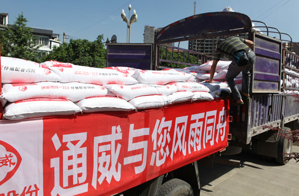 5月20日,通威再襄義舉。受通威集團董事局劉漢元主席委托,通威股份副總裁陳平福攜著近兩萬通威人對蘆山地震災區的深厚情誼,積極響應中共四川省委農工委的號召,向蘆山縣政府捐贈價值人民幣近200萬元的450噸通威水產飼料、豬飼料,支援災區人民災后重建。中共四川省委常委、省委農工委主任李昌平,四川省人民政府副省長曲木史哈等領導出席捐贈儀式,中共蘆山縣委副書記、蘆山縣人民政府縣長王華代表蘆山縣政府接受捐贈。