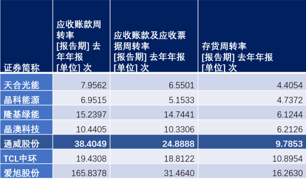 硅料、電池片雙龍頭通威股份,在去年的應收賬款周轉率高達38.40次。