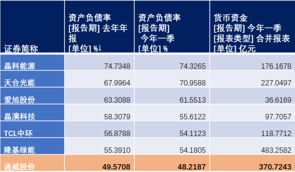 在光伏大擴產時代,較低的資產負債率、較高的在手貨幣現金,是所有企業應對周期波動與市場風險的安全墊。SNEC展會期間,一些行業大佬提到產能過剩。光伏產業發展到今天,已經經歷數次洗牌,每次被淘汰出局的,無疑都是資金鏈斷掉的企業。其實,頭部光伏企業均已意識到了產能過剩條件下的資產負債表。從去年開始,各大光伏企業一手擴產能,一手也在著力降杠桿、控負債。2022年報、2023年1季報顯示,通威的資產負債率均低于50%,在頭部企業中無疑是最穩健的一家。